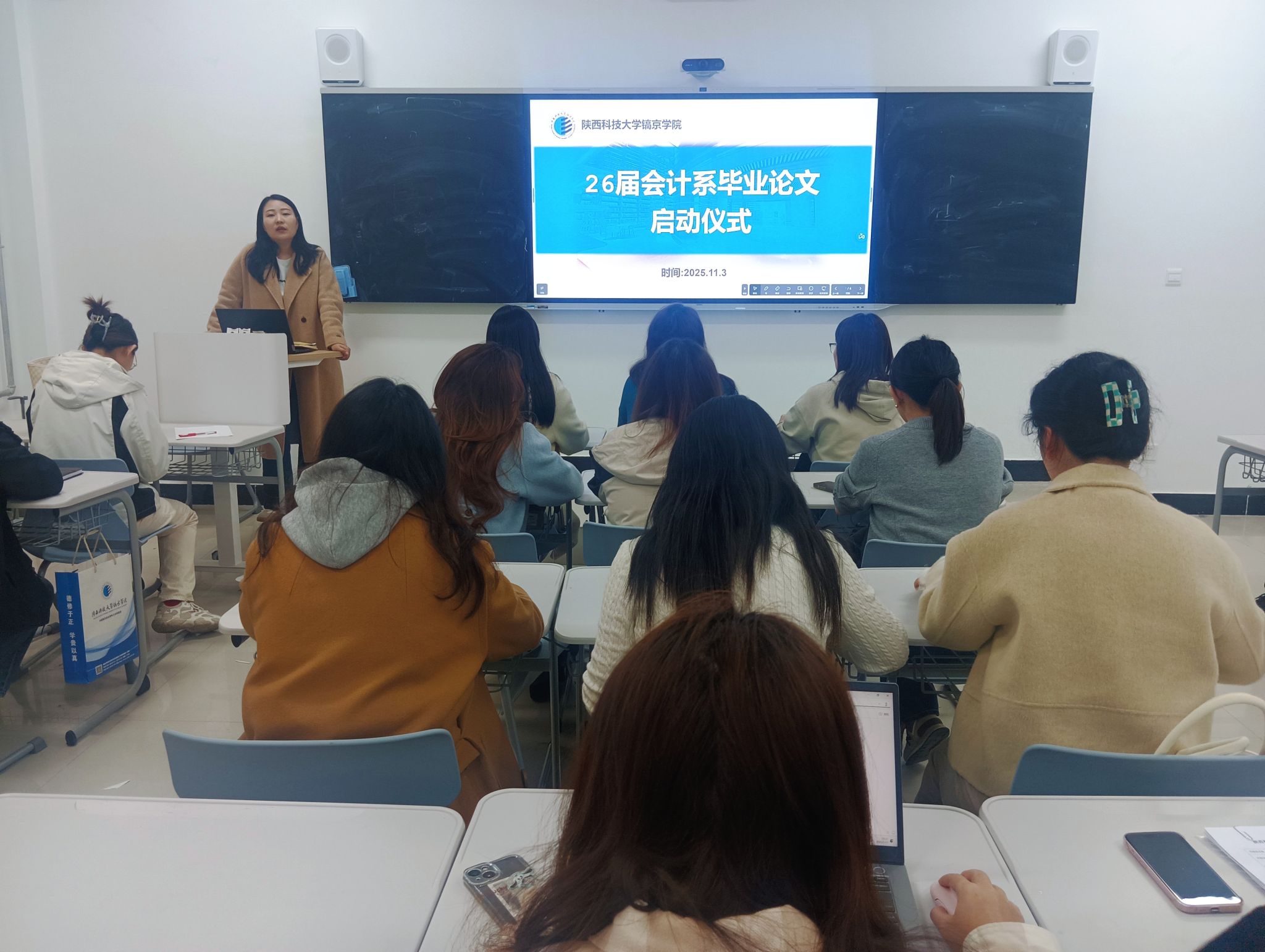为深入贯彻国家关于高等教育高质量发展的总体要求,落实立德树人根本任务,切实加强本科毕业论文(设计)质量管理工作,11月3日,会计系在教学楼314召开本科毕业论文推进会。会议旨在进一步规范毕业论文(设计)全过程管理,明晰工作流程与质量标准,全面提升人才培养质量。本次会议由会计系主任姚叶叶主持,会计系全体2026届毕业论师参会。