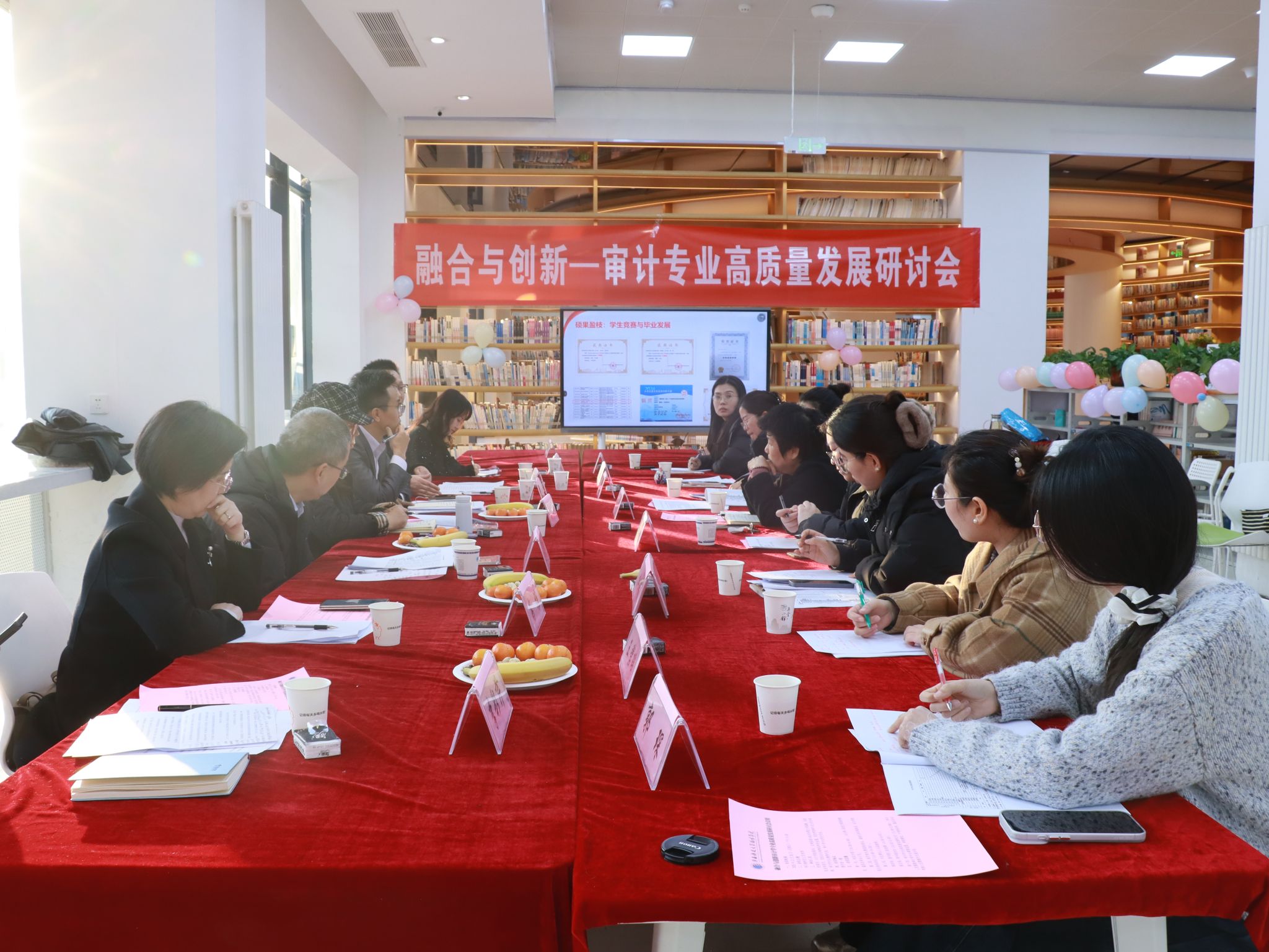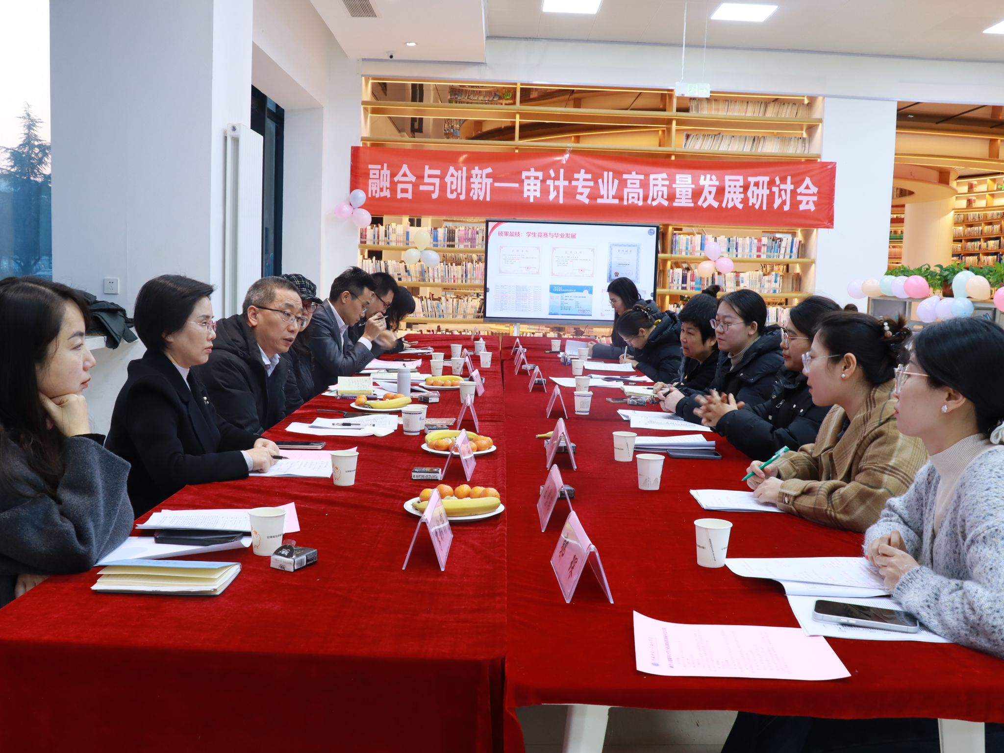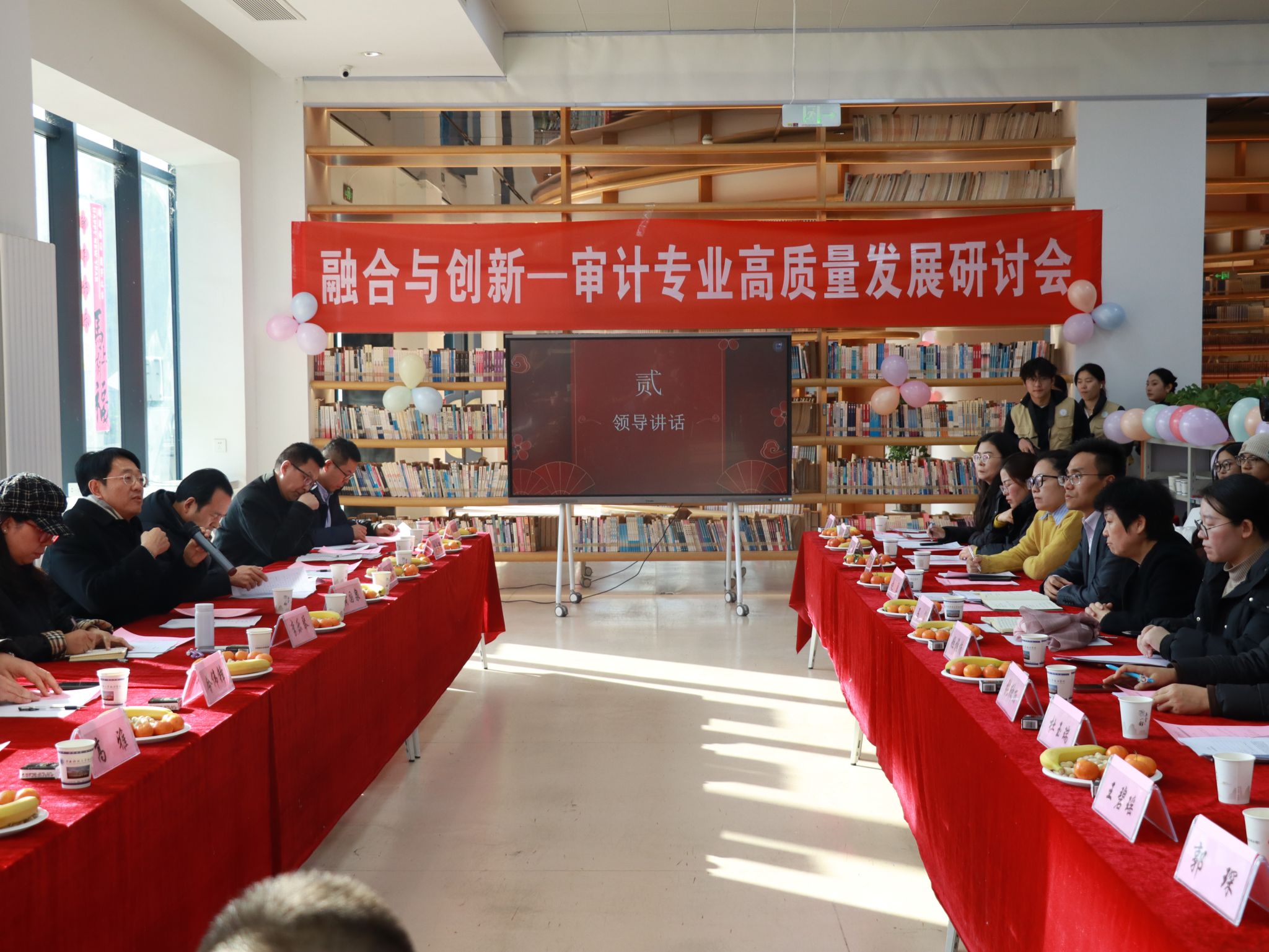 会议分为联欢和研讨两个环节。首先是领导讲话和带头人致辞。黄校长在讲话中指出,审计专业要对接人才需求,从理论教学、实践教学等方面不断创新,培养复合型人才。李校长在讲话中指出,审计专业要持续深化OBE导向,不断优化课程体系改革,不断创新教学模式,不断提升实践教学效能,教师要以严教严管保障输出人才的培养质量。赵院长在讲话中指出了专业发展与行业需求的对接路径和产教融合长效机制建设。专业带头人马焱教授在致辞中回顾了审计学专业近三年的发展情况,并就审计学专业高质量发展研讨会主题:“融合”与“创新”结合专业改革与发展以及2026版人才培养方案的修订等进行了方向性的解码。