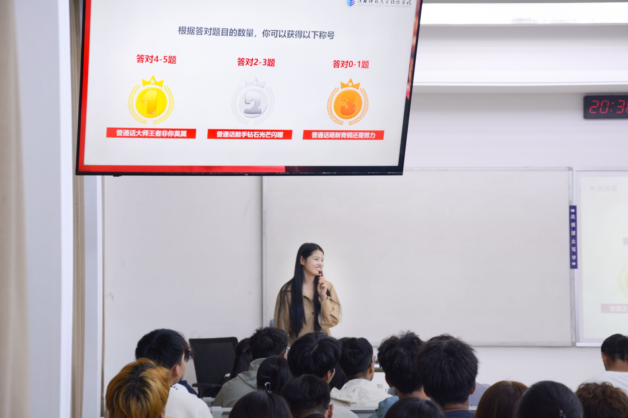 各班紧扣活动主题,设计多元实践形式:经典诵读环节,学子以标准普通话演绎文学经典,让语言魅力与文化底蕴深度融合;演讲比赛中,学生围绕“语言规范”“文化传承”等话题展开分享,展现清晰的表达逻辑;语言文字知识竞赛则通过趣味题型,检验同学们对普通话标准的掌握程度,现场互动踊跃、氛围热烈,充分彰显会院学子的语言素养。