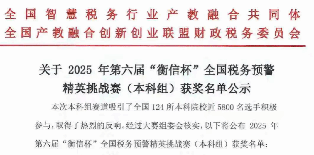 该赛事由全国智慧税务行业产教融合共同体主办,全国产教融合创新创业联盟财政税务委员会协办,浙江衡信教育科技有限公司提供技术支持,赛事竞争激烈,吸引了来自全国124所本科院校的近5800名选手同场竞技,赛事于2025年7月7日至7月27日期间进行,通过连续21天的线上比拼,全面考验选手的税务预警专业知识与实战能力。
