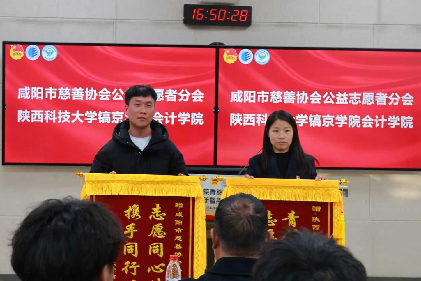 活动现场,王鹏会长代表协会向会计学院赠送“青鸽展翅传温情,志愿同行践使命”锦旗,感谢学院长期以来对公益事业的大力支持与志愿服务队的突出贡献;韩雅轩副院长代表学院回赠“志愿同心传大爱,携手同行暖世间”锦旗,致敬协会在公益领域的引领作用与多方协作的深厚情谊,双方以锦旗为媒,凝聚起校企联动、共促公益的强大合力。