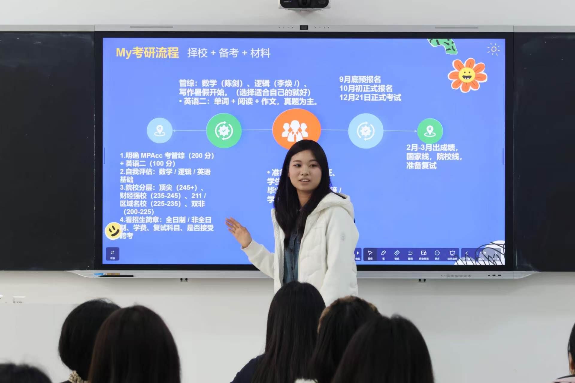 此次考研经验分享会,不仅为备考学子搭建了交流学习的平台,让大家在研途少走弯路、蓄力前行,更以考研升学为重要支点,为同学们拓宽职业发展路径、提升就业核心竞争力奠定基础。未来,会计学院将继续整合优质资源,将考研指导与就业赋能深度融合,通过系列化、专业化的指导活动,帮助同学们明晰发展方向,无论是考研升学还是直接就业,都能找准定位、提升能力,助力全体学子在人生赛道上稳步前行,实现个人成长与职业发展的双向奔赴。