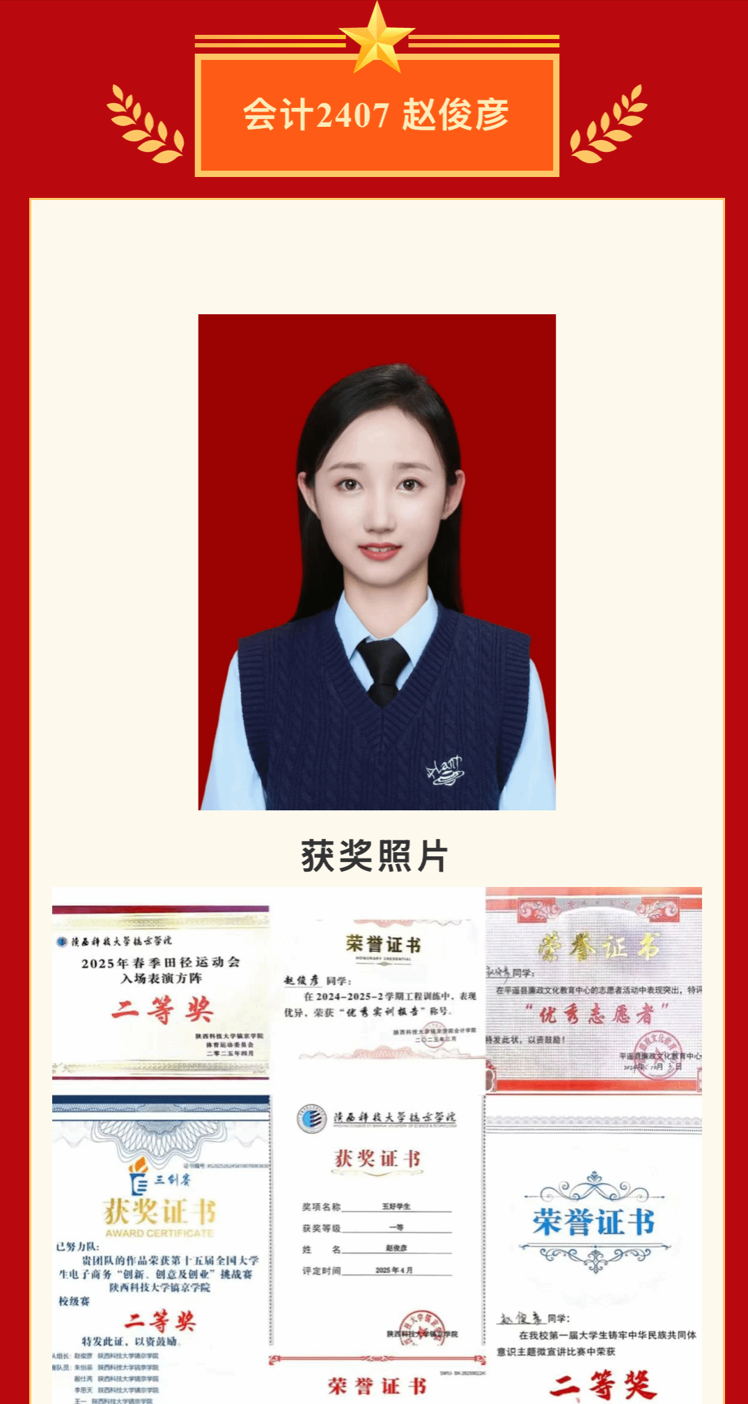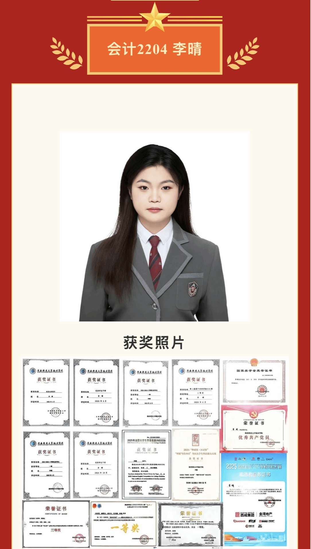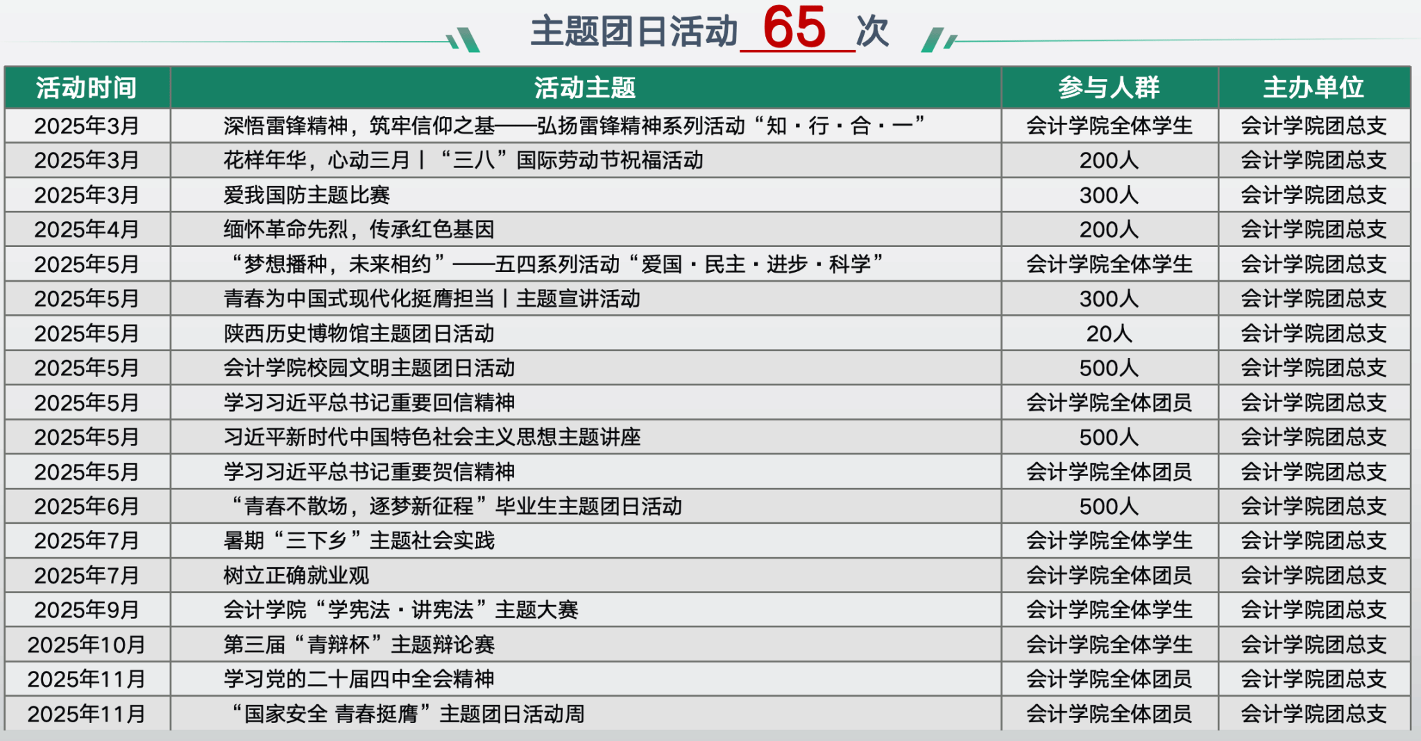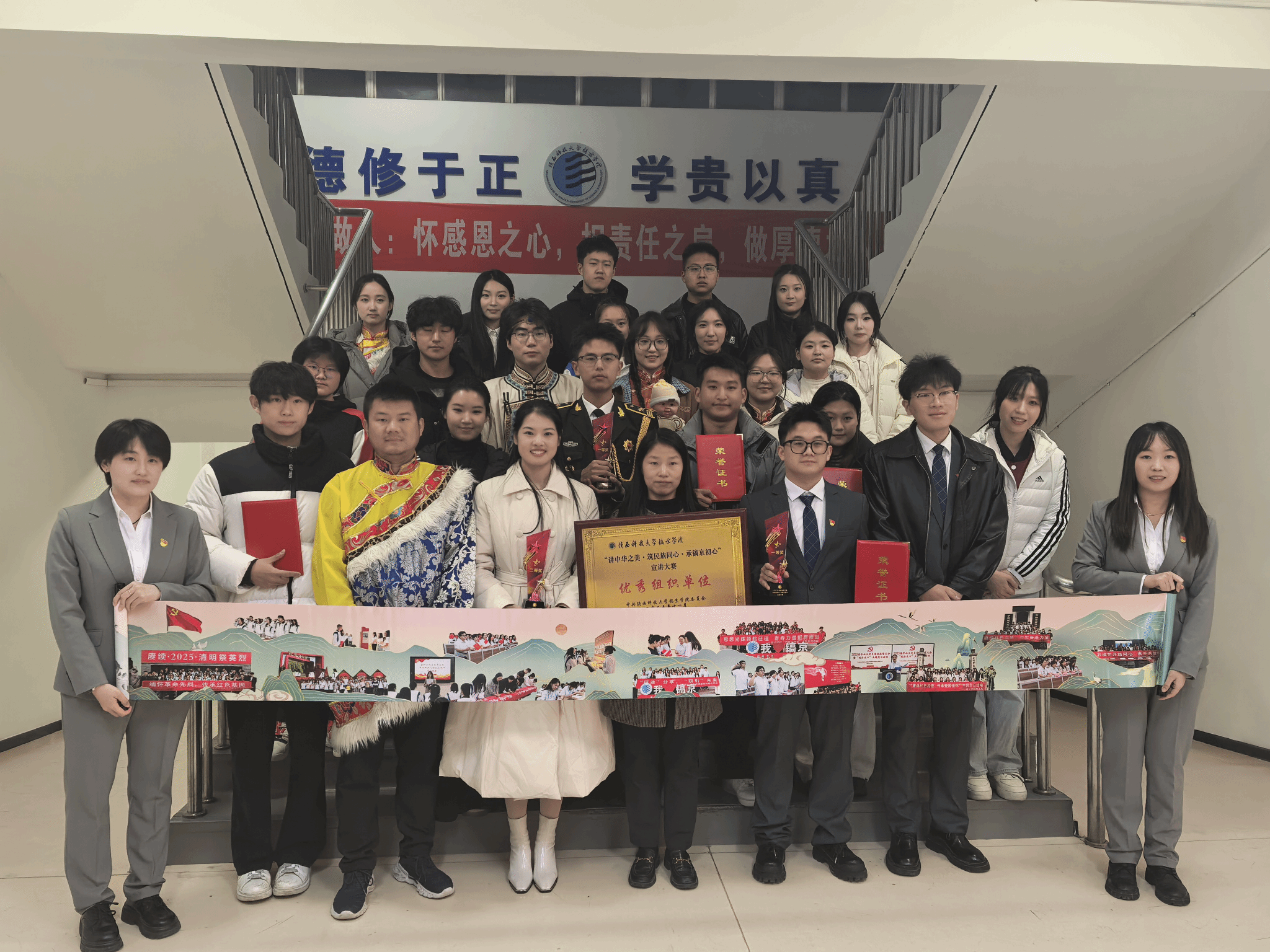坚持党建带团建,开创党团落实立德树人新局面。学院团总支以重要时间节点和历史事件为契机,组织开展红色文化教育、理想信念教育、品德素质教育系列主题团日活动65场、主题教育活动19次,覆盖全院团员。活动内容丰富多样,包括弘扬雷锋精神系列活动、陕西历史博物馆主题团日、“学宪法·讲宪法”主题大赛、第三届“青辩杯”辩论赛、召开第一次学生代表大会等。2025年,3个团支部获得“五四红旗团支部”,6个团支部获评“五四先进团支部”,10余名同学荣获“优秀共青团干部”,90余名同学获评“优秀共青团员”,学院团总支被评为校级“五四红旗团总支”。