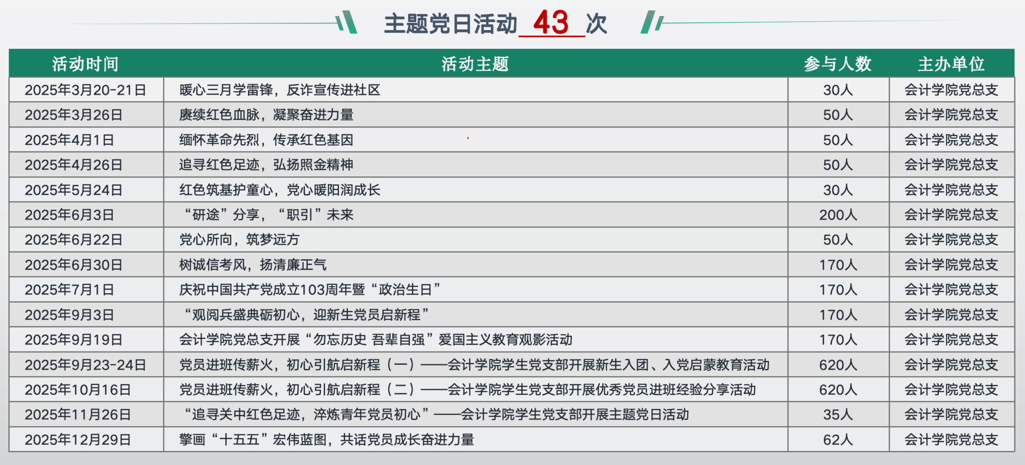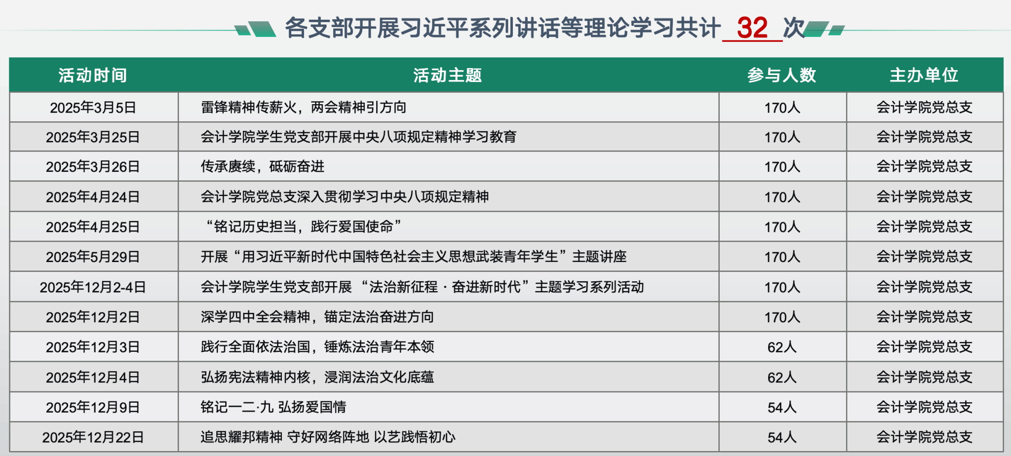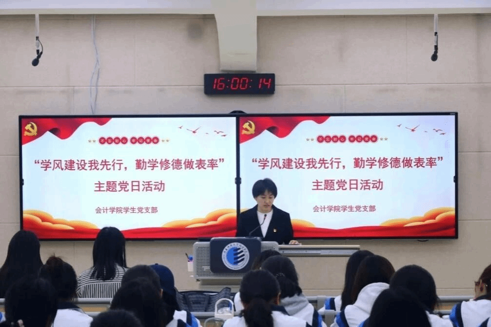 会计学院党总支全年常态化开展 32 次理论学习研讨,围绕习近平新时代中国特色社会主义思想、中央八项规定精神,党的二十届四中全会精神等核心内容,通过专题讲座、集中学习、研讨交流等形式开展学习,让党的创新理论真正浸润心灵、融入行动。