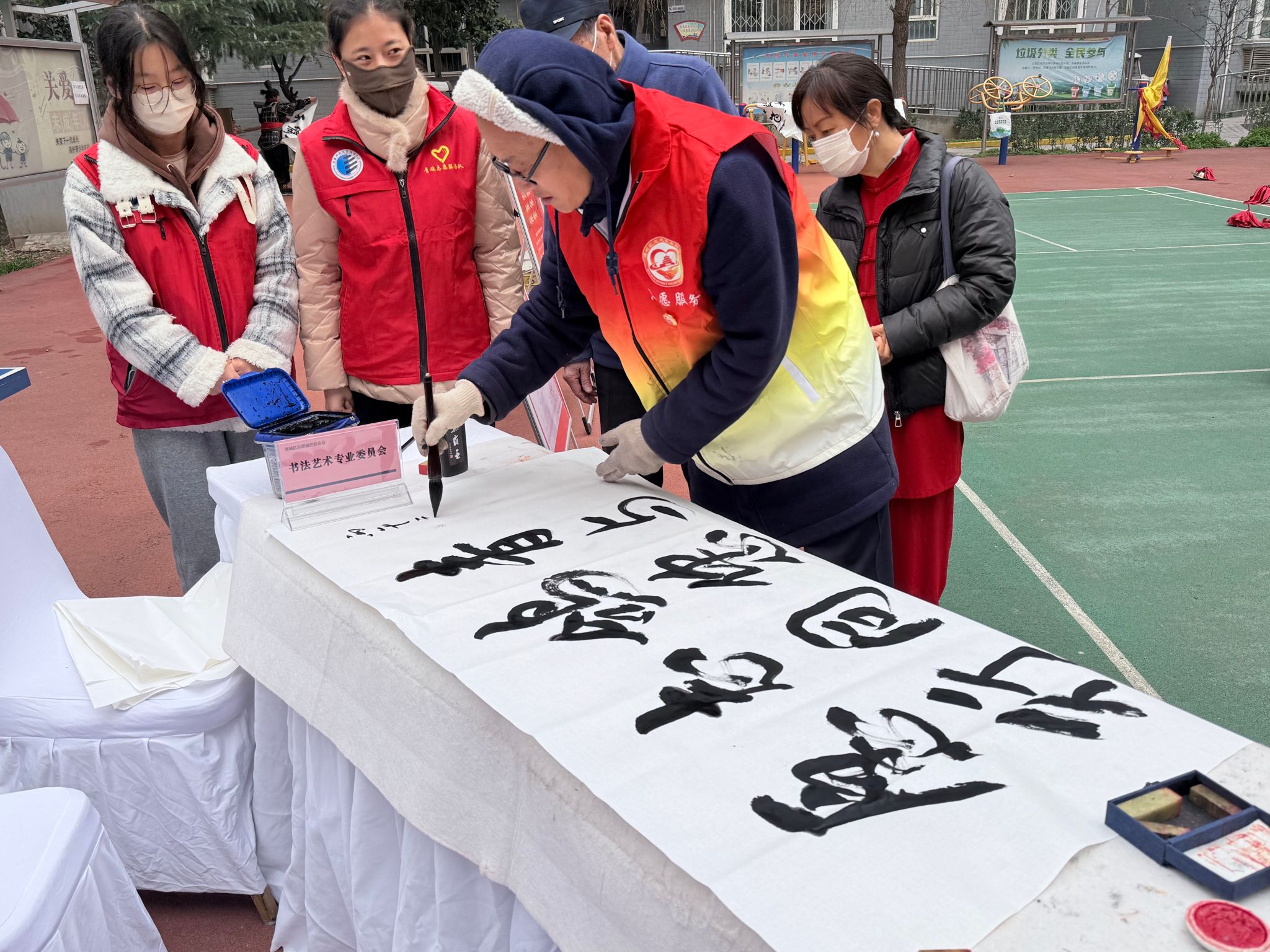 在互动环节,志愿者们与社区小朋友一起游戏、聊天、互动游玩,用陪伴温暖童心,现场气氛轻松愉快。同时,志愿者还与社区居民一同书写毛笔字,在笔墨书香中感受传统文化魅力,增进彼此交流,营造出和谐温馨的邻里氛围。